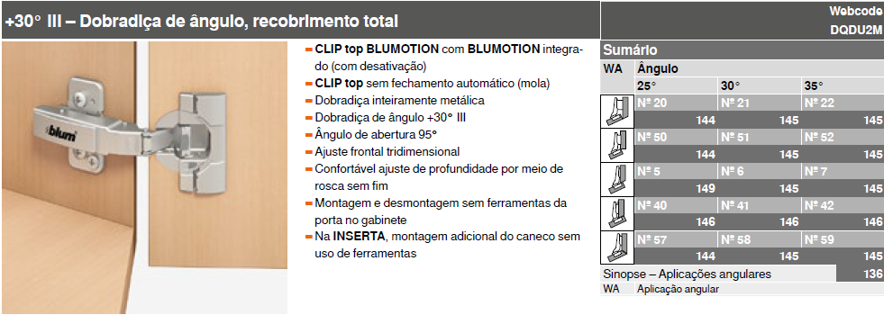 ‘+30º III – Dobradiça de Ângulo, recobrimento total